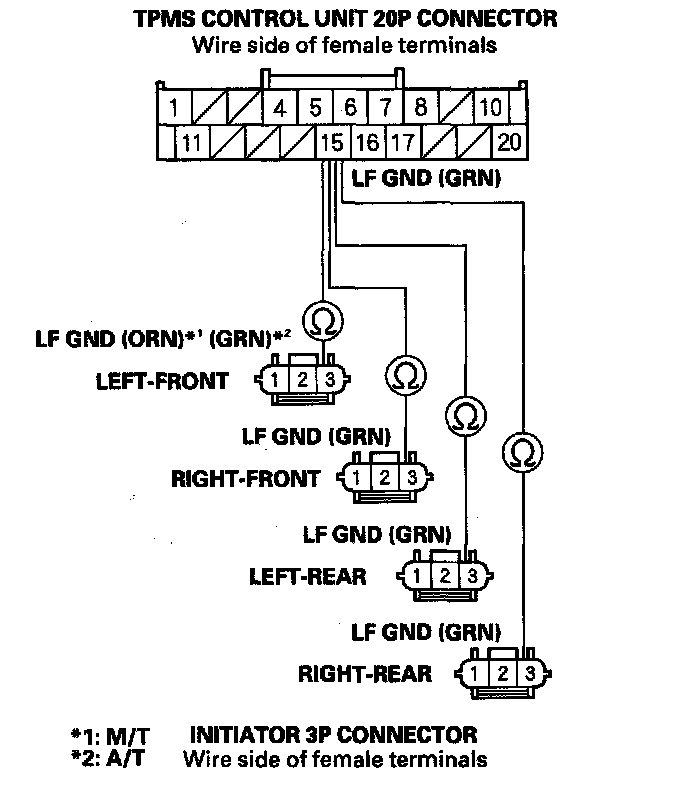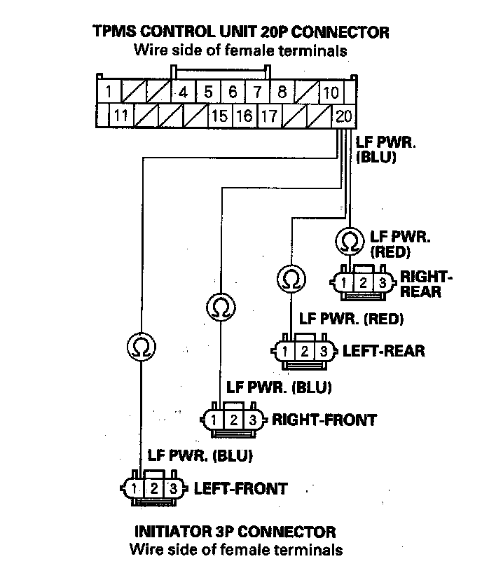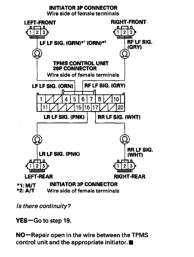 18. Check for continuity between the appropriate TPMS control unit 20P connector terminal and appropriate initiator 3P connector terminal No. 2 (see table).