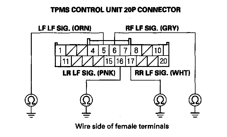 19. Check for continuity between body ground and the appropriate TPMS control unit 20P connector terminal (see table).