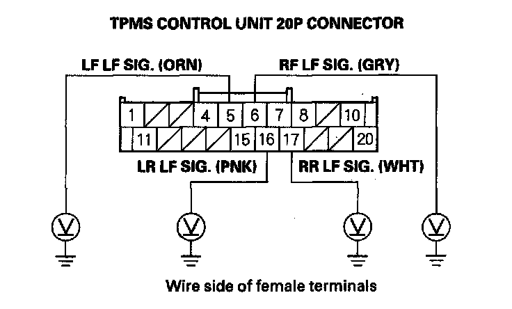 21. Measure voltage between body ground and the appropriate TPMS control unit 20P connector terminal (see table).