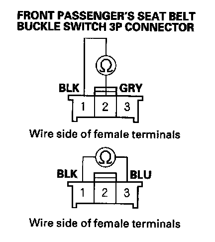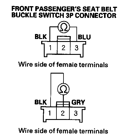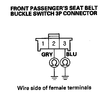 Measure the resistance between the No. 1 and No. 2 terminals of the front passenger's seat belt buckle switch 3P connector. There should be 0-1 ohms.