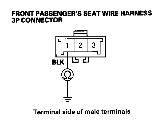 9. Measure the resistance between the No. 1 terminal of the front passenger's seat wire harness 3P connector and body ground. There should be 0-1 ohms.