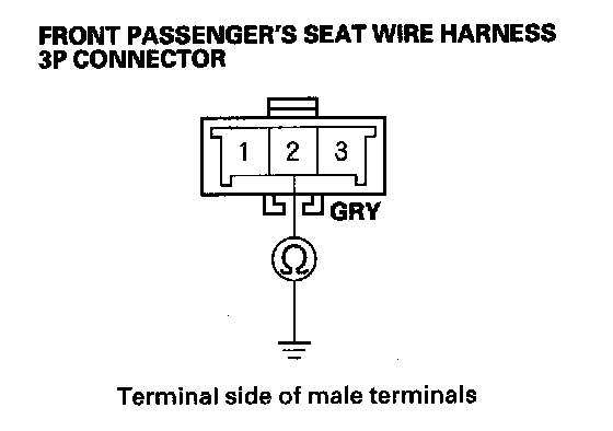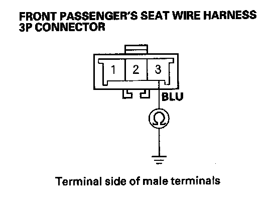 14. Measure the resistance between the No. 3 terminal of the front passenger's seat wire harness 3P connector and body ground. There should be an open circuit or at least 1 Mohms.