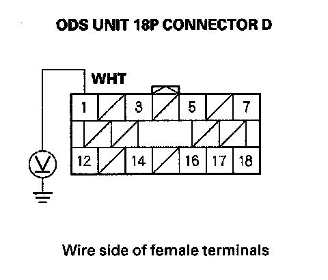 9. Measure the voltage between the No. 1 terminal of ODS unit 18P connector D and body ground. There should battery voltage.