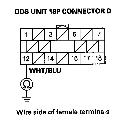 15. Measure the resistance between the No. 12 terminal of the ODS unit 18P connector D and body ground. There should be 0-1.0 ohms.