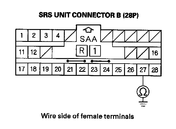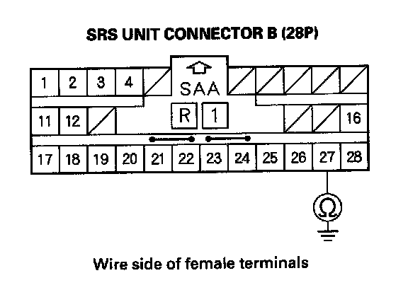 19. Measure the resistance between the No. 27 terminal of SRS unit connector B (28P) and body ground. There should be an open circuit or at least 1 Mohms.