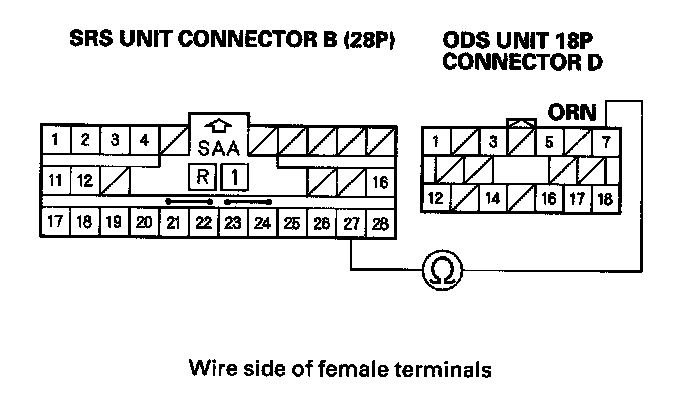 20. Measure the resistance between the No. 27 terminal of SRS unit connector B (28P) and the No. 7 terminal of ODS unit 18P connector D. There should be 0-1.0 ohms.