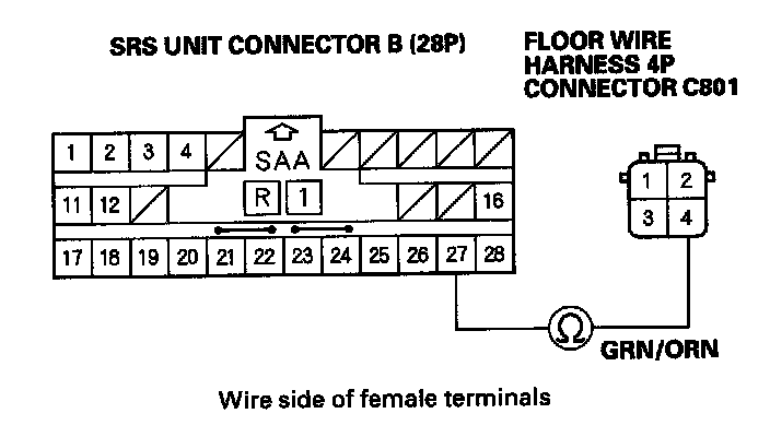 22. Measure the resistance between the No. 27 terminal of SRS unit connector B (28P) and the No. 4 terminal of floor wire harness 4P connector C801. There should be 0-1.0 ohms.