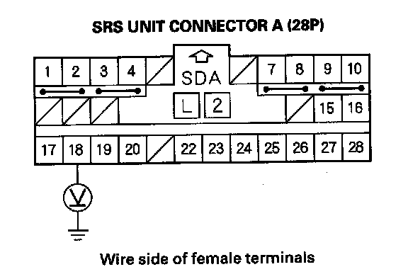 5. Connect a voltmeter between the No. 18 terminal of SRS unit connector A (28P) and body ground. Turn the ignition switch ON (II), and measure the voltage. There should be battery voltage.