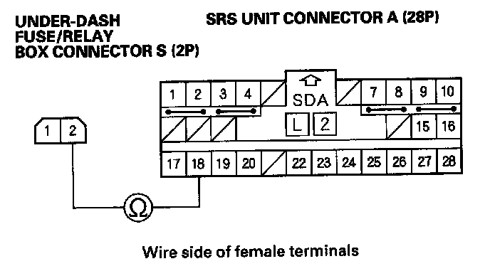 8. Measure the resistance between the No. 2 terminal of the under-dash fuse/relay box connector S (2P) and the No. 18 terminal of SRS unit connector A (28P). There should be 0-1.0 ohms.