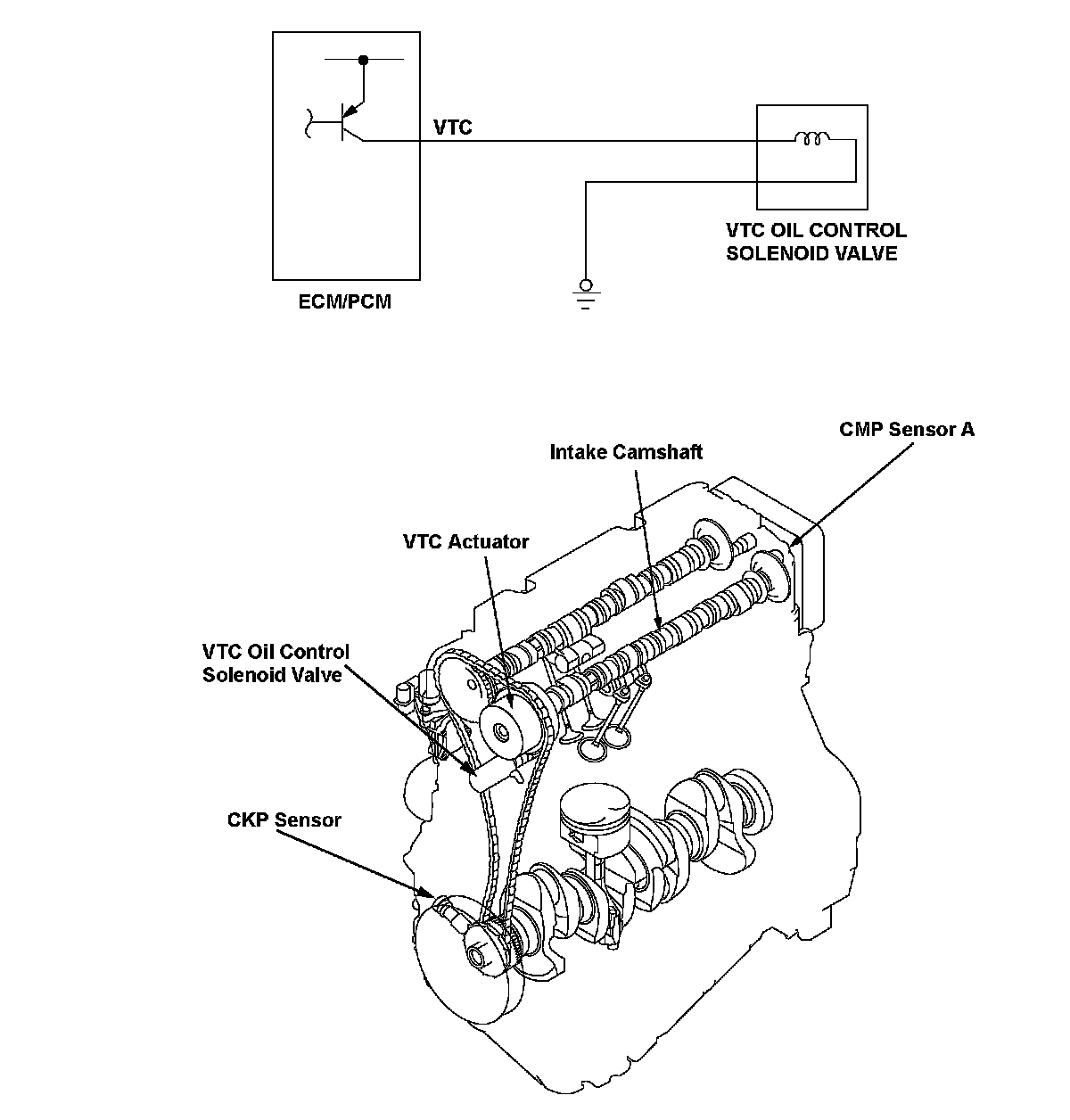 The variable valve timing control (VTC) consists of the VTC actuator, the VTC oil control solenoid valve, sensors, and the engine control module (ECM)/powertrain control module (PCM). The ECM/PCM controls the VTC oil control solenoid valve by duty cycle and supplies hydraulic pressure to the advance chamber or the retard chamber in the actuator so the valve timing is optimized depending on the driving conditions (engine load, engine speed, and vehicle speed). If the current when compared to the output duty cycle is out of a set value, the ECM/PCM detects a malfunction and stores a DTC.