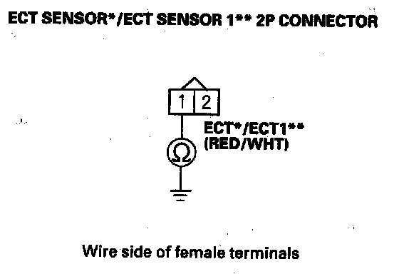 10. Check for continuity between ECT sensor*/ECT sensor 1** 2P connector terminal No. 1 and body ground.