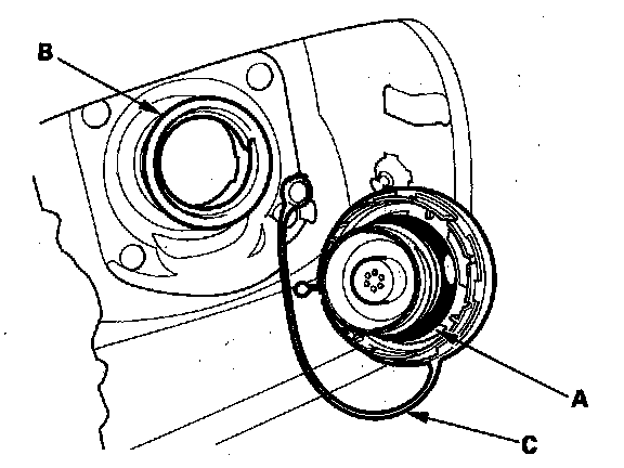 2. Check the fuel fill cap seal (A) and the fuel fill pipe mating surface (B). Verify that the fuel fill cap tether cord (C) is not caught under the cap.