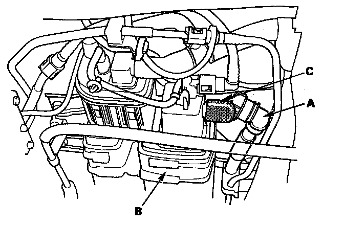 15. Disconnect the fresh air hoses (A) from the EVAP canister vent shut valve (B), and plug the EVAP canister vent shut valve ports (C).