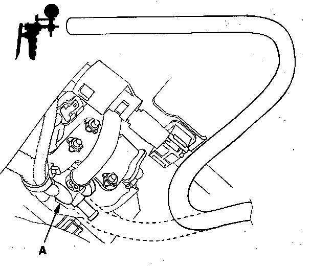 9. Disconnect the vacuum hose (purge line) from the EVAP canister purge valve (A) in the engine compartment, and connect the vacuum pump/gauge, 0-30 in.Hg, to the hose as shown.