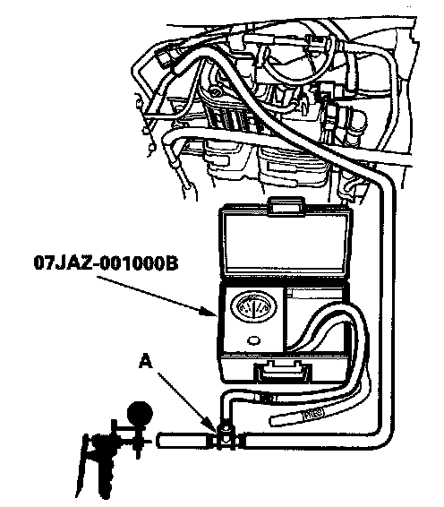 10. Disconnect the vacuum hose from the EVAP canister purge line (EVAP canister side), and connect a T-fitting (A) from the vacuum gauge and the vacuum pump/gauge, 0-30 in.Hg, to the hose as shown.