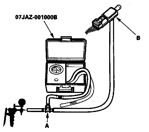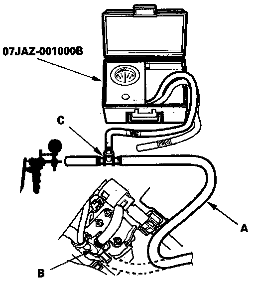 19. Disconnect the vacuum hose (A) from the EVAP canister purge valve (B), and connect a T-fitting (C) from the vacuum gauge and the vacuum pump/gauge, 0-30 in.Hg, to the hose as shown.