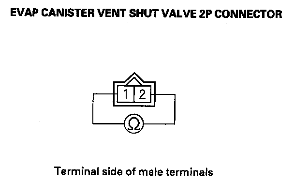 10. At the valve side, measure resistance between EVAP canister vent shut valve 2P connector terminals No. 1 and No. 2.