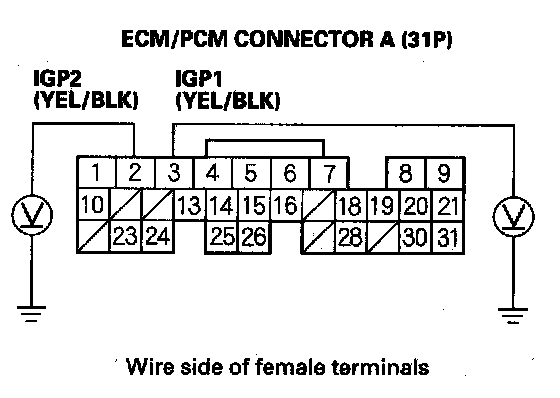 18. Measure voltage between body ground and ECM/PCM connector terminals A3 and A2 individually.