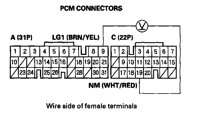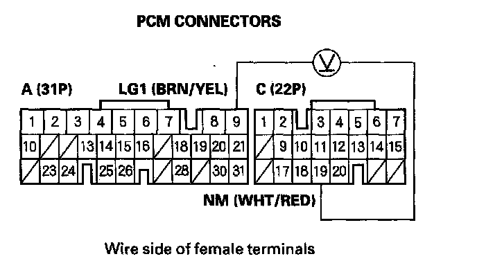 25. With the engine idling, measure the voltage between PCM connector terminals C19 and A9.