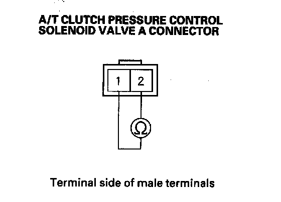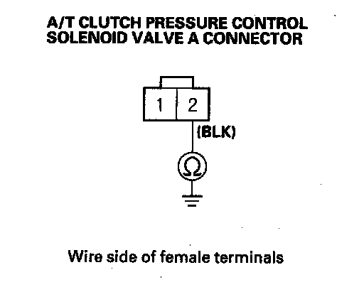 10. Measure the resistance between A/T clutch pressure control solenoid valve A connector terminals No. 1 and No. 2.