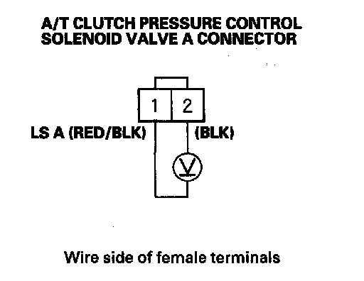 13. Measure the voltage between A/T clutch pressure control solenoid valve A connector terminals No. 1 and No. 2.