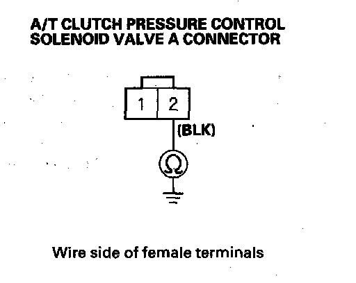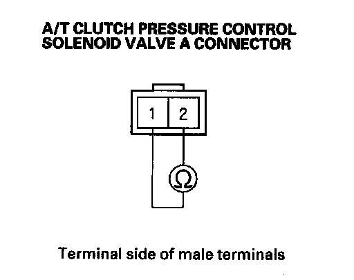 10. Measure the resistance between A/T clutch pressure control solenoid valve A connector terminals No. 1 and No. 2.