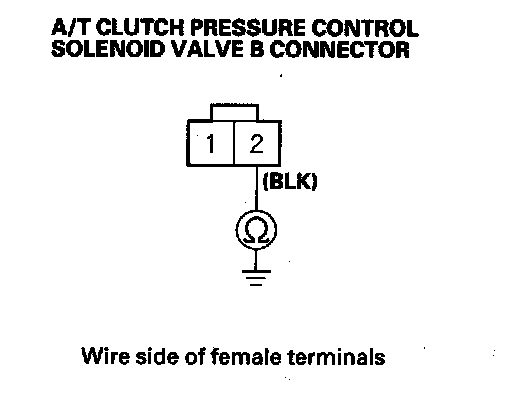 10. Measure the resistance between A/T clutch pressure control solenoid valve B connector terminals No. 1 and No. 2.