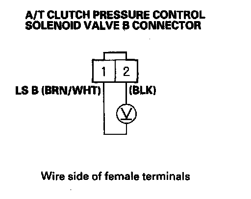 13. Measure the voltage between A/T clutch pressure control solenoid valve B connector terminals No. 1 and No. 2.
