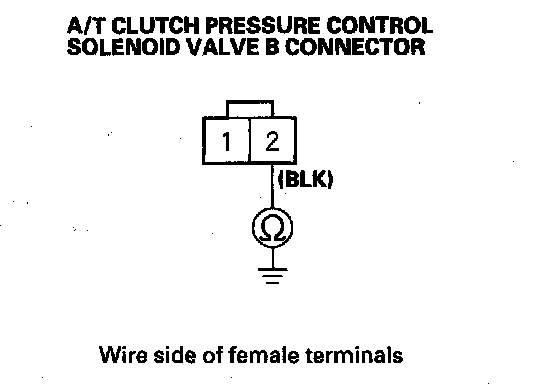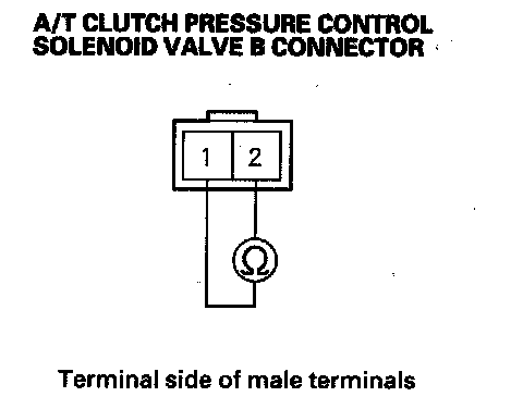 10. Measure the resistance between A/T clutch pressure control solenoid valve B connector terminals No. 1 and No. 2.