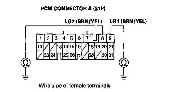 5. Check for continuity between PCM connector terminal A8 and body ground, and between PCM connector terminal A9 and body ground.