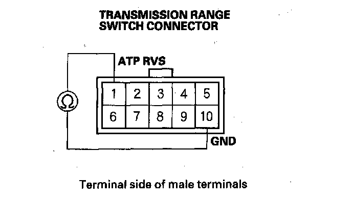 11. Check for continuity between transmission range switch connector terminals No. 1 and No. 10. The shift position must be R.