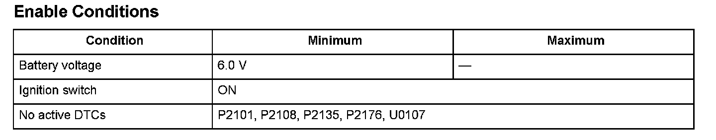 When the output voltage to the throttle actuator exceeds the specification for a set time, the throttle actuator control module detects a malfunction and transmits the malfunction data to the ECM/PCM. When the ECM/PCM receives the malfunction data from the throttle actuator control module, the ECM/PCM detects a malfunction of the throttle actuator system and stores a DTC.