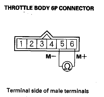 4. At the throttle body side, measure resistance between throttle body 6P connector terminals No. 5 and No. 6 with the throttle fully closed.