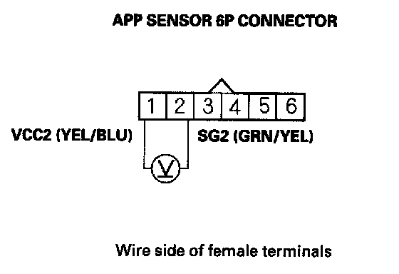 6. Measure voltage between APP sensor 6P connector terminals No. 1 and No. 2.
