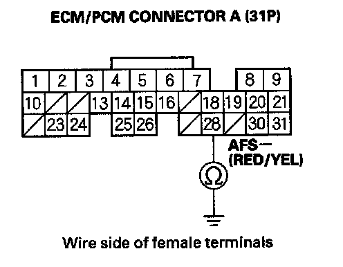 9. Check for continuity between ECM/PCM connector terminal A28 and body ground.
