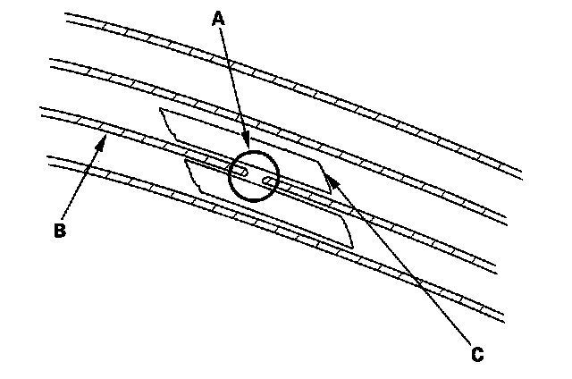 2. Carefully mask above and below the broken portion of the window antenna wire (B) with cellophane tape (C).