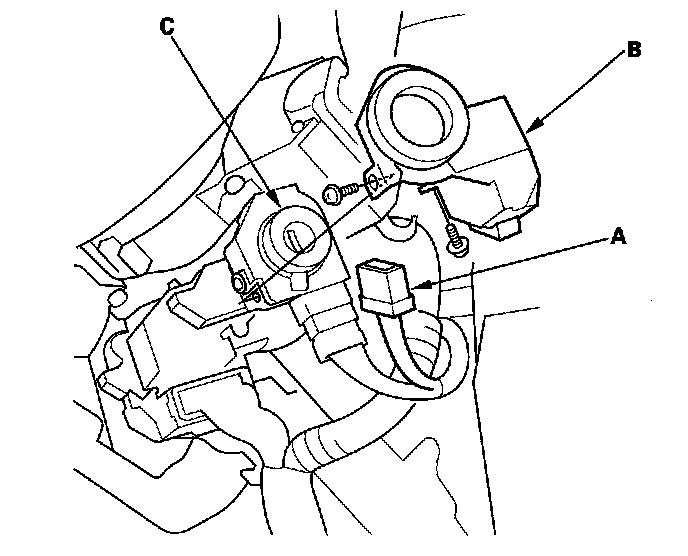 4. Remove the two screws and the immobilizer control unit-receiver from the ignition key cylinder (C).