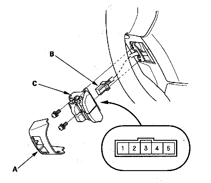 2. Disconnect the 5P connector (B) and remove the HFL switch or HFL-voice control switch (C).