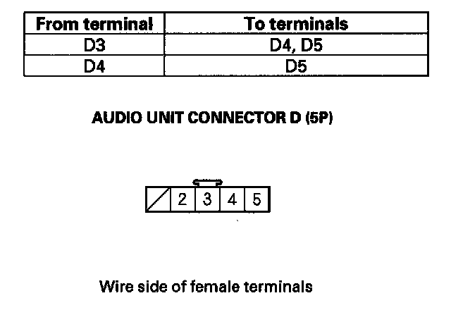 8. Check for continuity between the terminals of audio unit connector D (5P) according to the table.