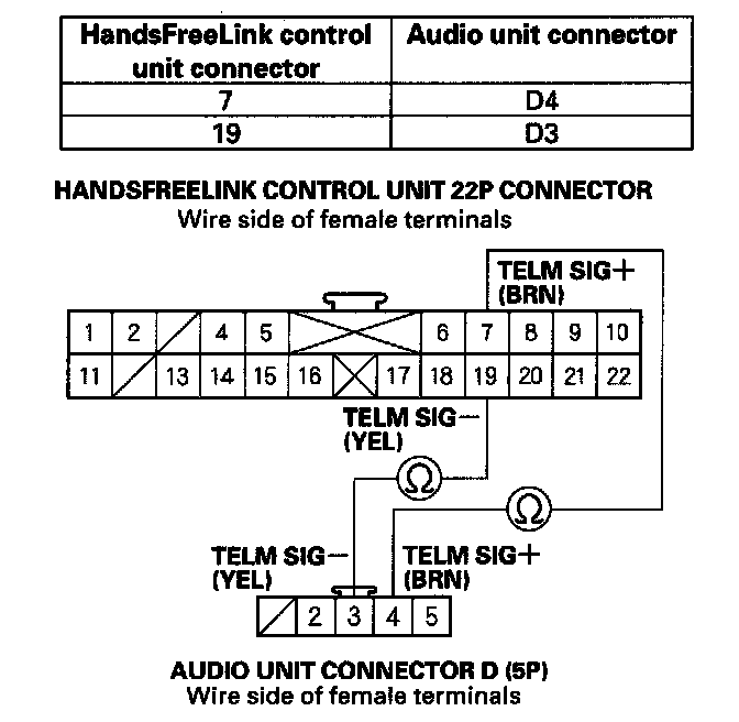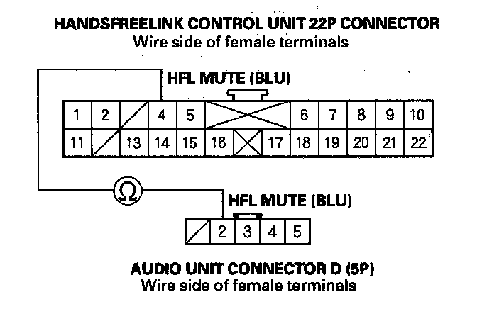 14. Check for continuity between HandsFreeLink control unit 22P connector terminal No. 4 and audio unit connector D (5P) terminal No. 2.