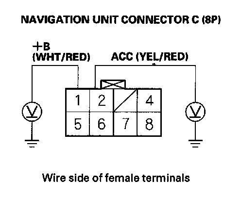 7. Measure the voltage between body ground and navigation unit connector C (8P) terminals No. 1 and No. 2 individually.