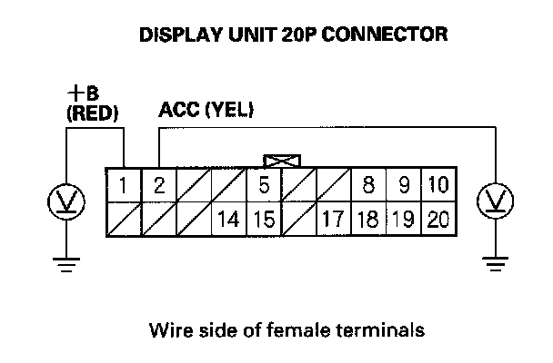 14. Measure the voltage between body ground and display unit 20P connector terminal No. 1 and No. 2 individually.