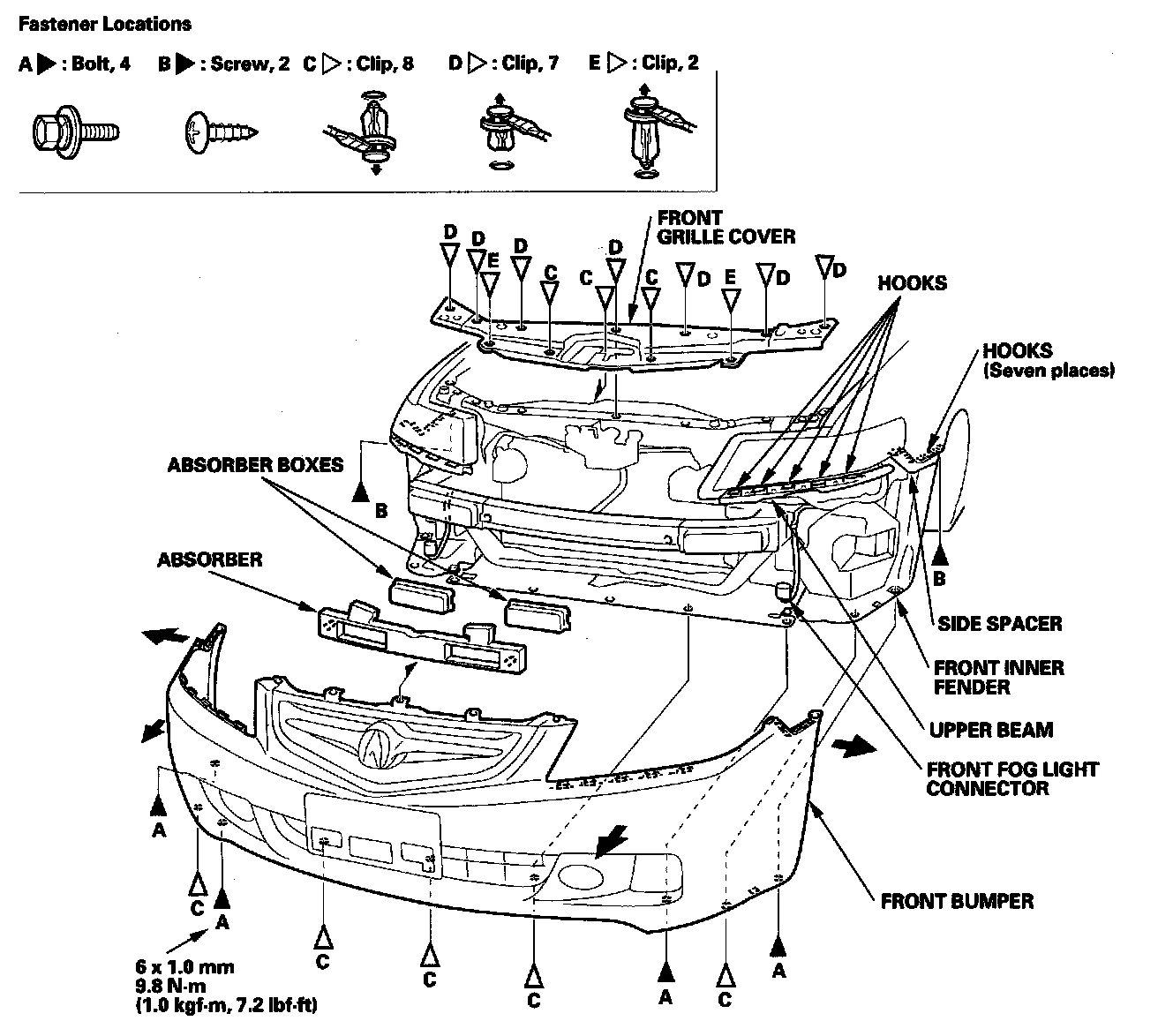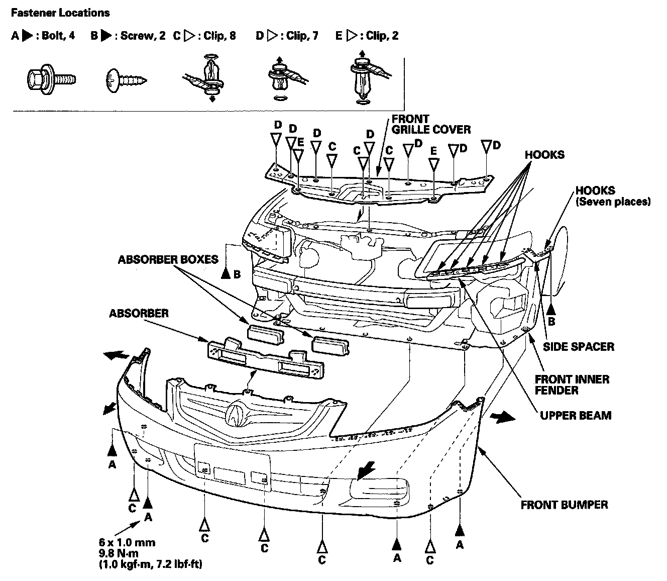 - Make sure the front bumper engages the hooks of the side spacers and upper beams on both sides securely.