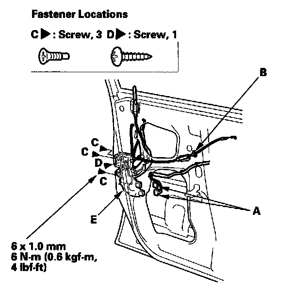 5. Disconnect the actuator connectors (A), and detach the inner handle cable clip (B). Remove the screws (C, D) securing the latch (E), and the lock cable protector.