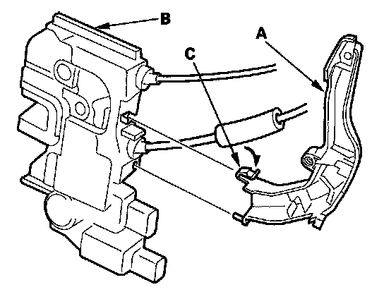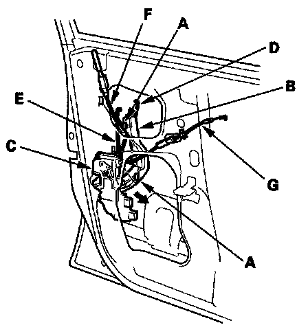 6. Release the hooks (A) of the lock cable protector (B) from the door, then remove the latch (C) (with the protector) through the hole in the door. Take care not to bend the outer handle rod (D), cylinder rod (E), lock cable (F), and inner handle cable (G).