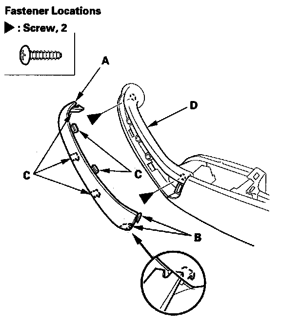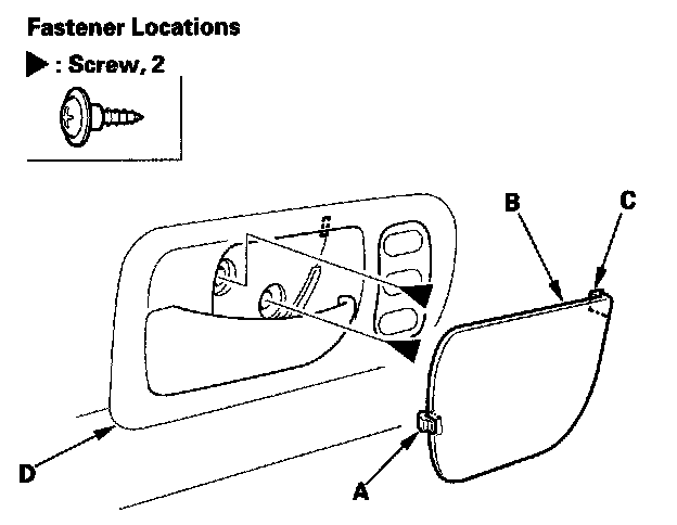 2. Using a trim tool, push on the rear hook (A) and pivot the cover (B) on the front hook (C), then remove the cover and the screws securing the inner handle (D).