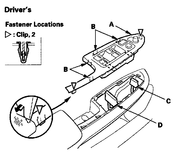 3. Disconnect the power mirror switch connector (C) (driver's) and the power window switch connector (D).