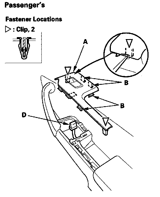 5. Passenger's: Pry out the bottom edge of the grip cover (A) with a trim tool to release the hooks (B), then pull out the cover to release the upper hooks (G), and remove the cover.