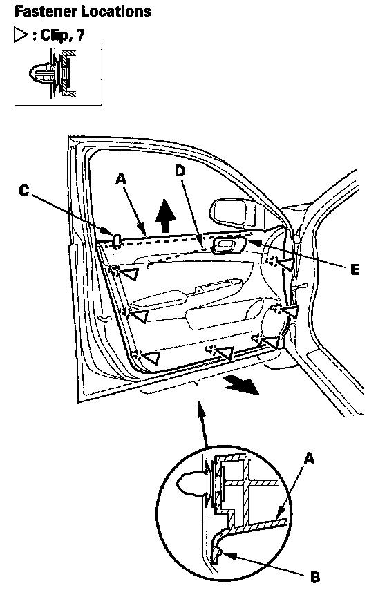 NOTE: The inner handle cable (D) is connected to the inner handle (E). Do not pull the door panel up too far, or the inner handle cable will be damaged.