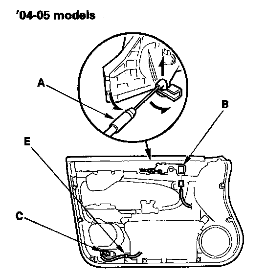 9. Disconnect the inner handle cable (A), power door lock switch connector (B) on passenger's door, courtesy light bulb socket (C), driving position memory switch connector (D), and detach the harness clip (E). Driver's door panel is shown passenger's door panel is similar.